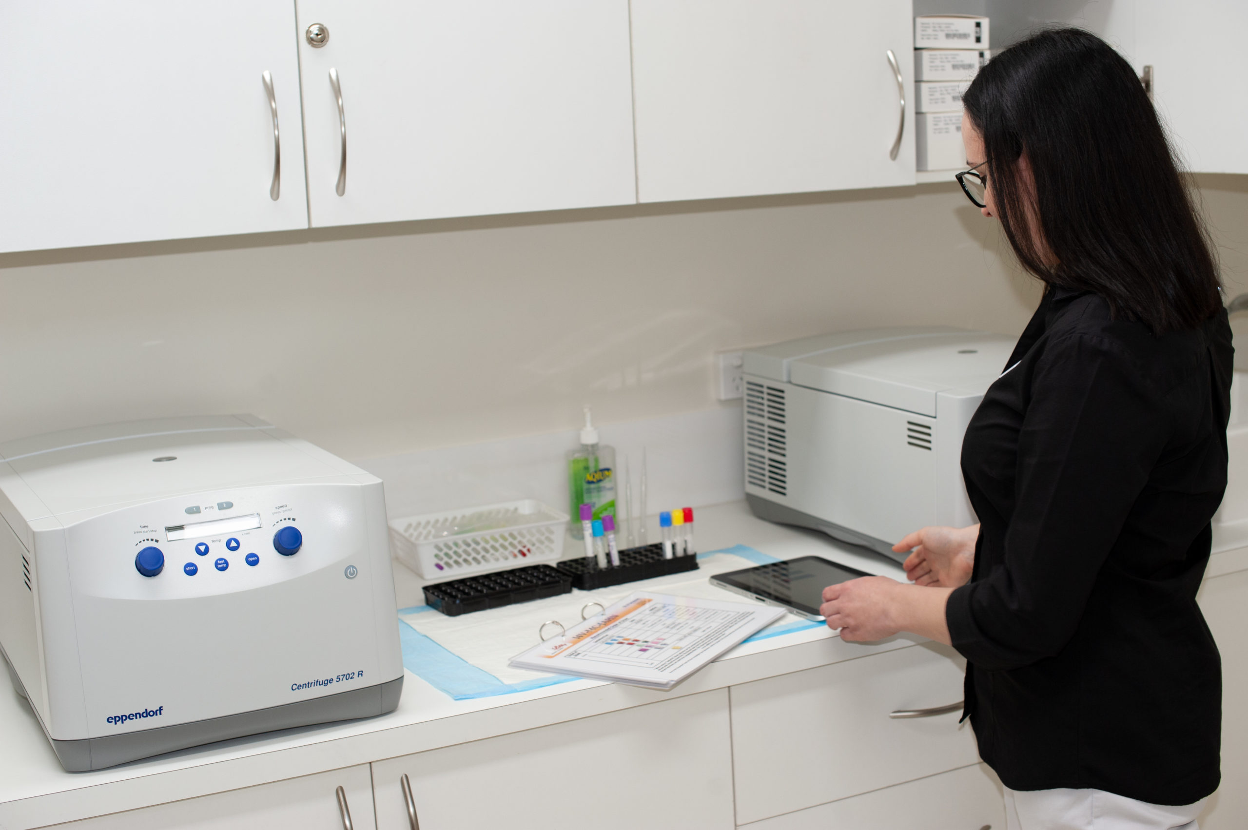 Our trial’s laboratory is located on level 2 and used by the trials team to process blood samples. The area equipped with: