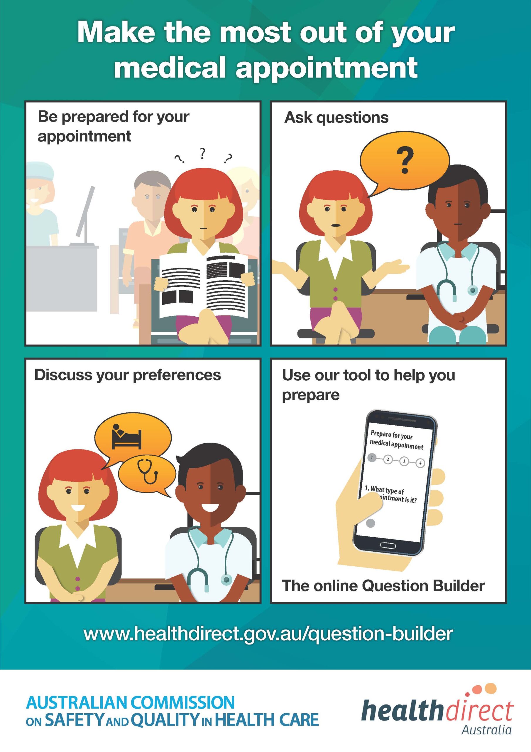 The Australian Commission on Safety and Quality in healthcare has also developed a Question Builder tool to help patients, carers and families consider questions to ask their doctor and prepare for a clinical consultation.